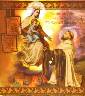 Abandonado de auxílio humano, São Simão recorria à Virgem, com toda a amargura de seu coração, pedindo-Lhe que fosse propícia à sua Ordem, tão provada, e que desse um sinal de sua aliança com ela. Na manhã do dia 16 de julho de 1251, suplicava com maior empenho à Mãe do Carmelo sua proteção, recitando a bela oração por ele composta, Flos Carmeli. Segundo ele próprio relatou ao Pe. Pedro Swayngton, seu secretário e confessor, de repente “a Virgem me apareceu em grande cortejo, e, tendo na mão o hábito da Ordem, disse-me: “‘Recebe, diletíssimo filho, este Escapulário de tua Ordem como sinal distintivo e a marca do privilégio que eu obtive para ti e para todos os filhos do Carmelo; é um sinal de salvação, uma salvaguarda nos perigos, aliança de paz e de uma proteção sempiterna. Quem morrer revestido com ele será preservado do fogo eterno’”.